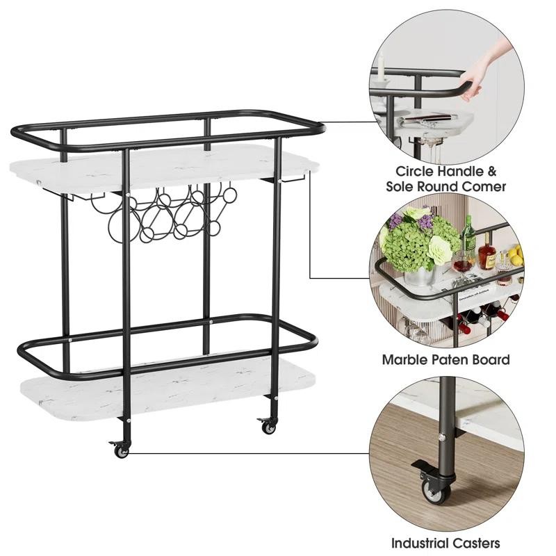 - Rolling bar cart equipped with four 360°swivel wheels, the home bar carts can be moved smoothly and quietly in your home kitchen dining room, and living room. And brakes can ensure the serving cart remains stable in one place.