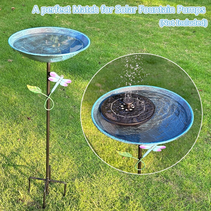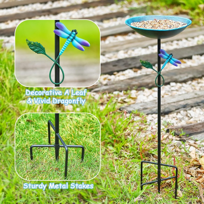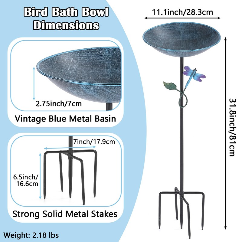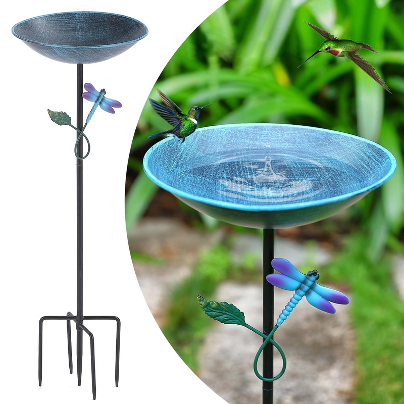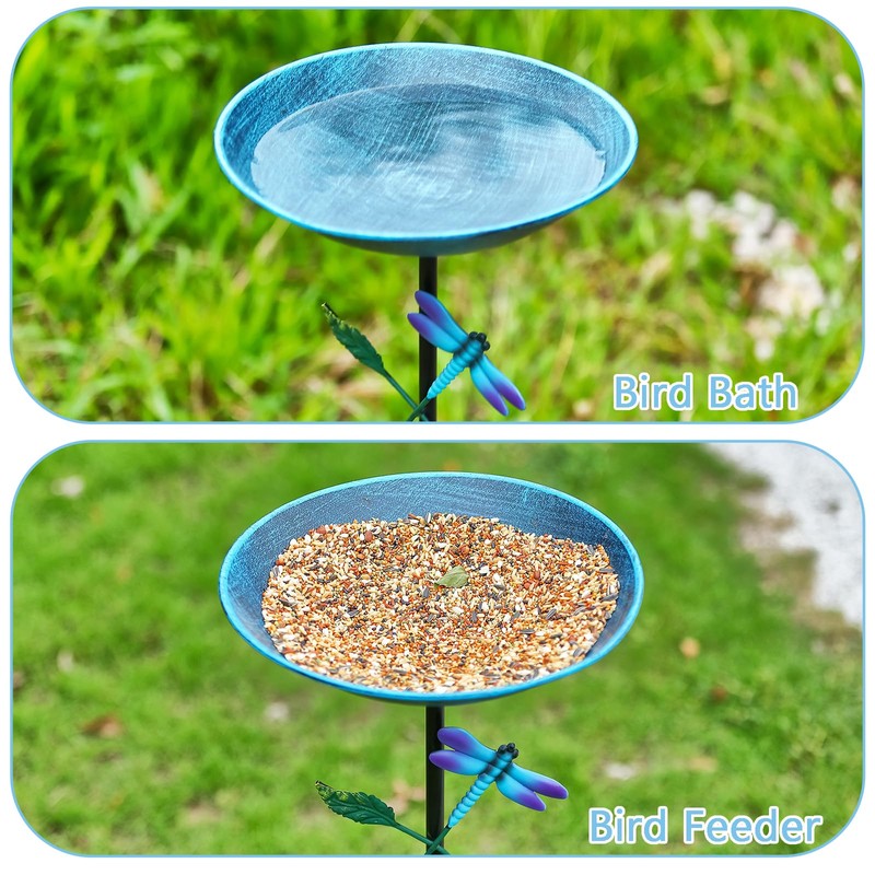 - Bird Baths Decorative Design: Featuring a charming vintage blue metal basin adorned with intricate dragonfly and leaf, this piece combines durability, functionality, and timeless elegance. Its eye-catching design enhances the visual appeal of any outdoor space, making it a standout addition to your garden or patio.