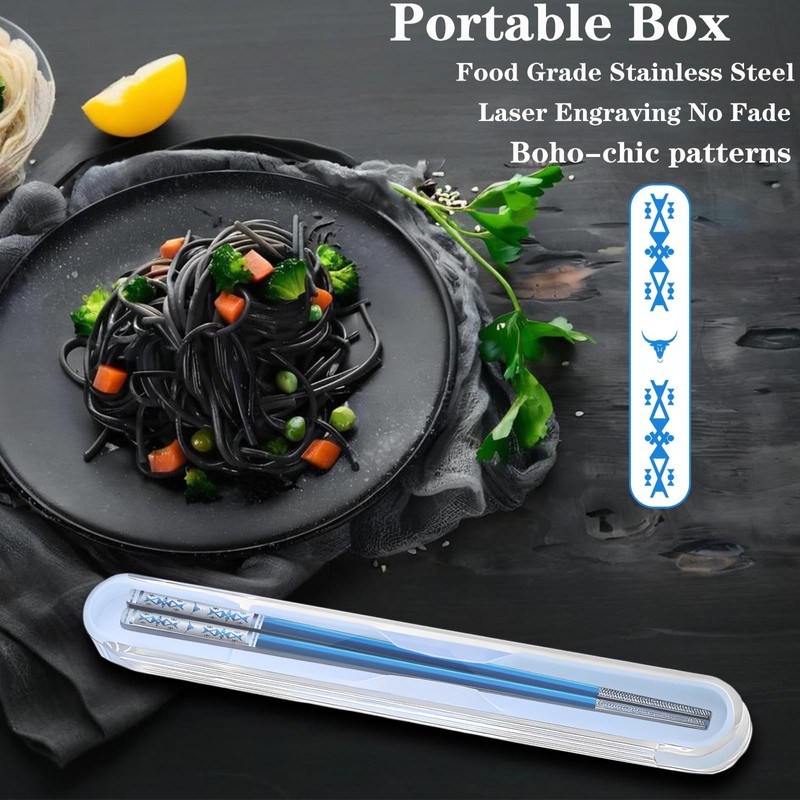 Premium Quality: The reusable chopsticks are made from food-grade 304 stainless steel. Premium sturdy material, square design & light weight, comfortable to hold and less rolling,The laser etching on the stainless steel chopsticks tip, easier to grab food  Unique Elegant Pattern: The metal chopsticks have beautiful boho style laser engraved patterns and will not fade with long term use,healthier and more sanitary  Reusable & Portable: The chopstick has light weight and small size(beginner friendly) and is neatly placed in a small pull design case that can be easily carried in a lunch bag or daily bag  Easy To Clean & Dishwasher Safe: The chopsticks dishwasher safe and easy to clean by hands too. Ideal for reusable chopsticks  Pretty Present: Craftsmanship and elegant chopsticks is a good present choice for Christmas, anniversaries, birthday party etc