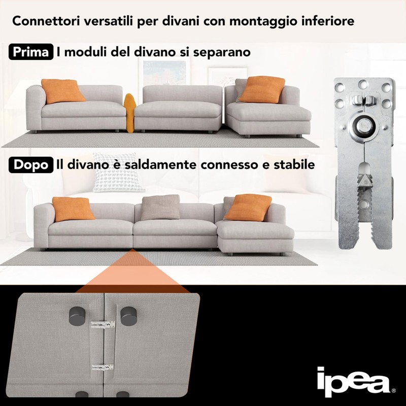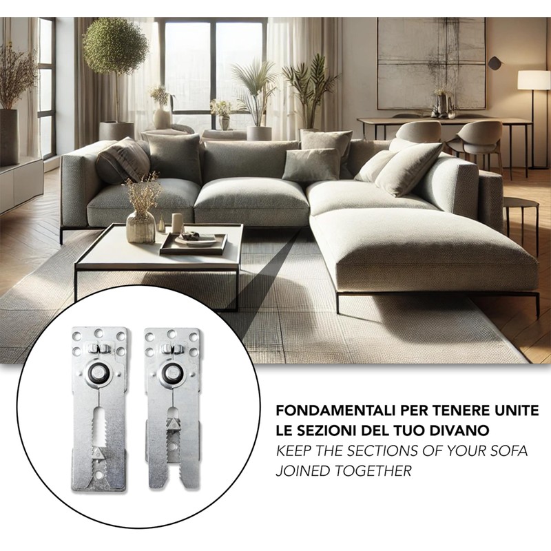 - Box contents: 2 sofa and furniture connectors with crocodile clips and springs that adapt to sofas and furniture and fix the parts firmly and strongly and prevent the parts from moving. 100% made in Italy.