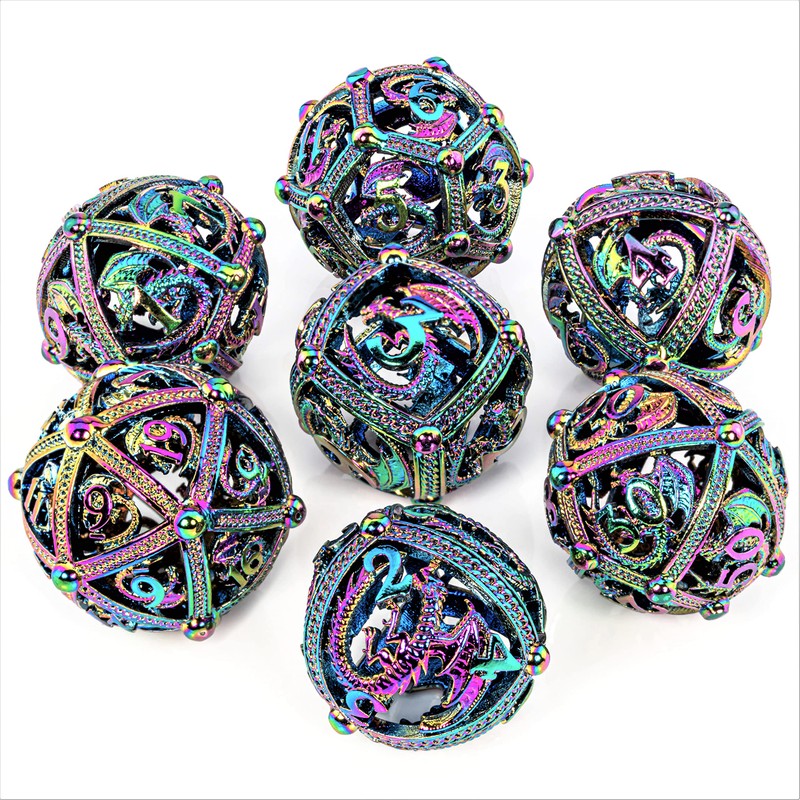 Metal DND Dice Set - Unique Round Hollow Orb Design for Better Rolling - Beautiful Dragon Set for Role Playing Games (RPG) - Stunning D&D Dungeons and Dragons Dice (Rainbow)