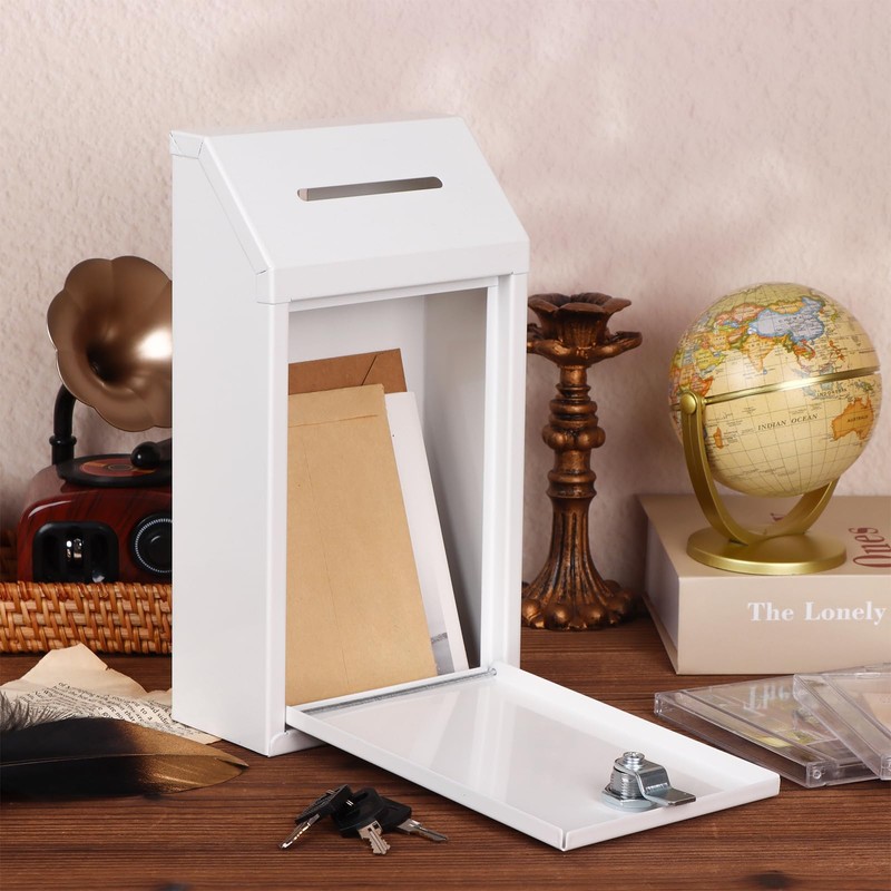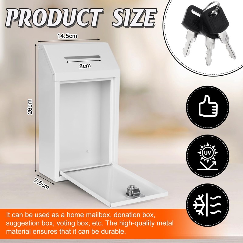 Metal Donation Box Collection Safe Suggestion Box with Lock Wall Mounted Mailbox Delivery Ballot Case Key Drop Case for Home Office Outdoor Door, 10.24 x 5.71 x 2.95 Inch (White)