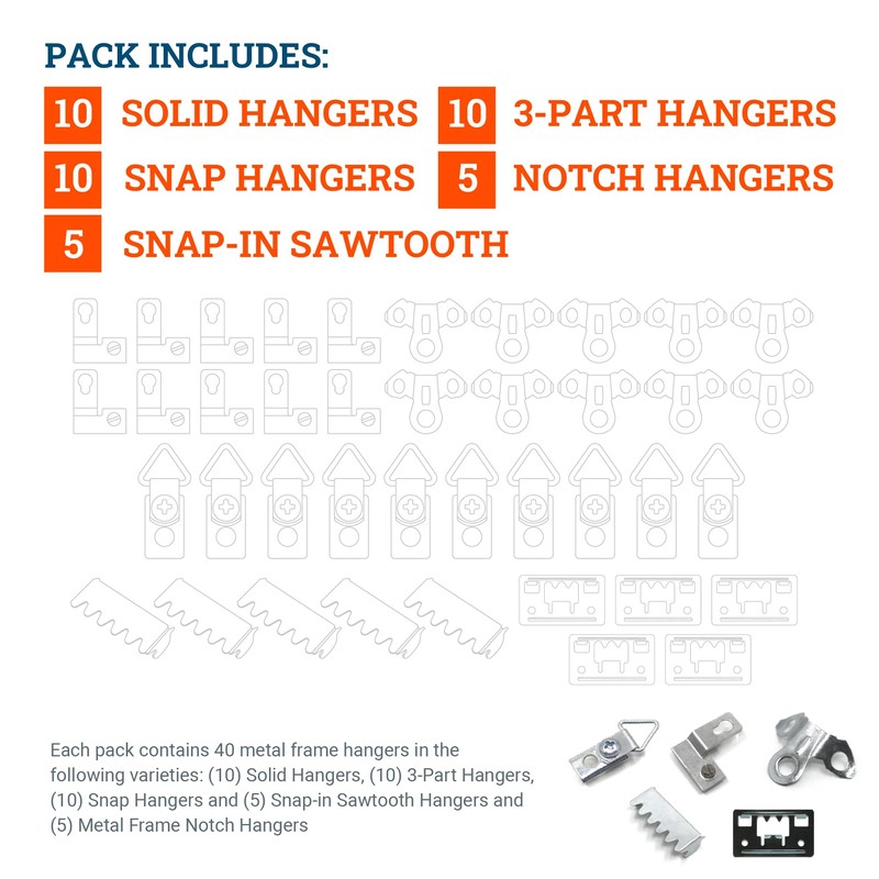 - This mounting kit includes (10) solid hangers, (10) 3-Part hangers, (10) snap hangers, (10) Euro Hangers, (5) snap-in sawtooth hangers, and (5) notch hangers. All included hangers can hang up to 30 metal frames.