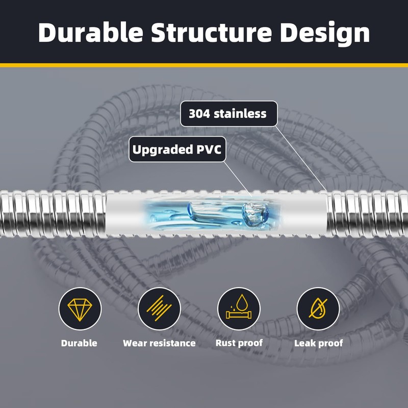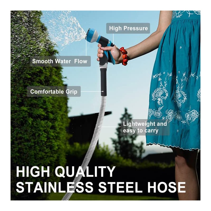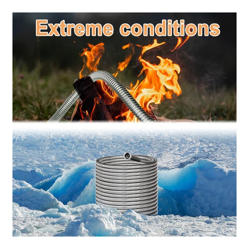 - Without Kinks and Tangles: The stainless steel garden hose body is wrapped with a stainless steel protective layer, providing consistent, stable, and high-pressure water output. The anti-tangle design prevents twisting, tangling, and knotting