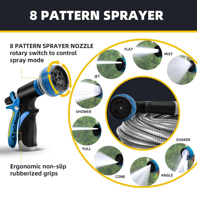 - Multi-functional 10 function nozzle: The ergonomic non slip rubber handle on the 10 function nozzle makes it easy to operate.You can easily switch between different spray modes without exerting too much force. Use this multifunctional nozzle to diversify your daily watering