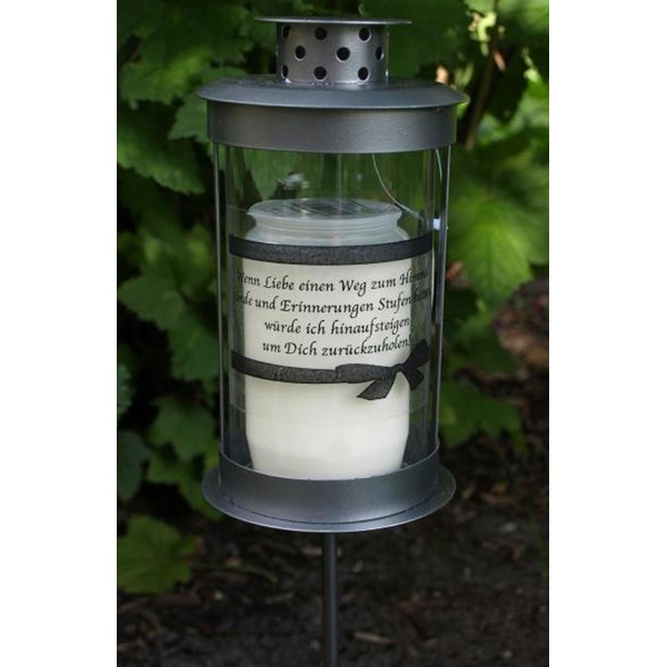 Metal grave lantern round including grave light and mourning saying, If love found a way to heaven and memories had steps, I would climb up to get you back. Grave lantern with saying. Day Burner No.3 with White Case. Colour: silver grey. Material: metal - glass. Size: lantern diameter 9 cm x 16 cm, total length with rod 40 cm. Box contents: 1 lantern with rod, includes 3 days burner and mourning saying