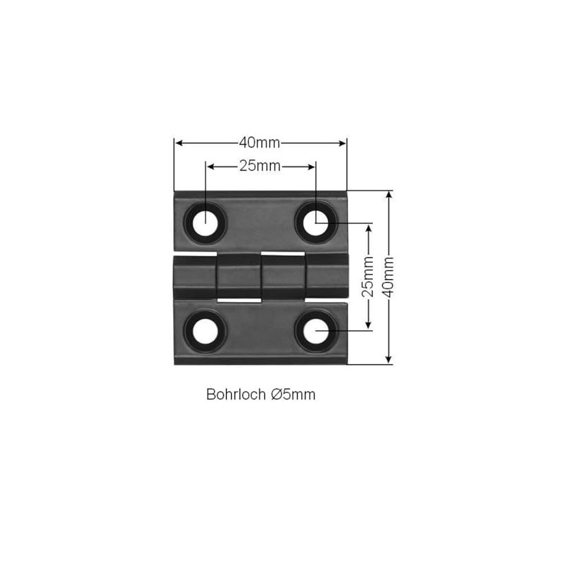 - Dimensions: the size is 40 mm x 40 mm per hinge. The hole spacing is 25 mm. The drill hole diameter of the hinges is 5 mm. The material thickness is 2 mm.