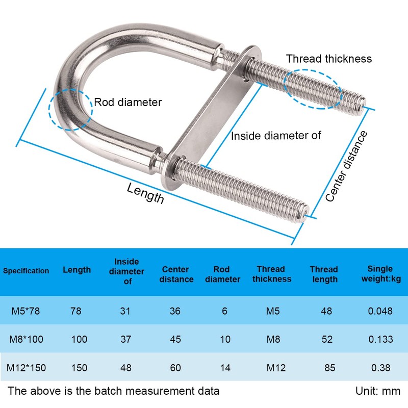 - Content size: M5*78 U-Bolts as total length 78mm, inner diameter 31mm, center distance 36mm, rod diameter 6mm, thread thickness is M5, thread length 48mm, single weight 0.048kg.