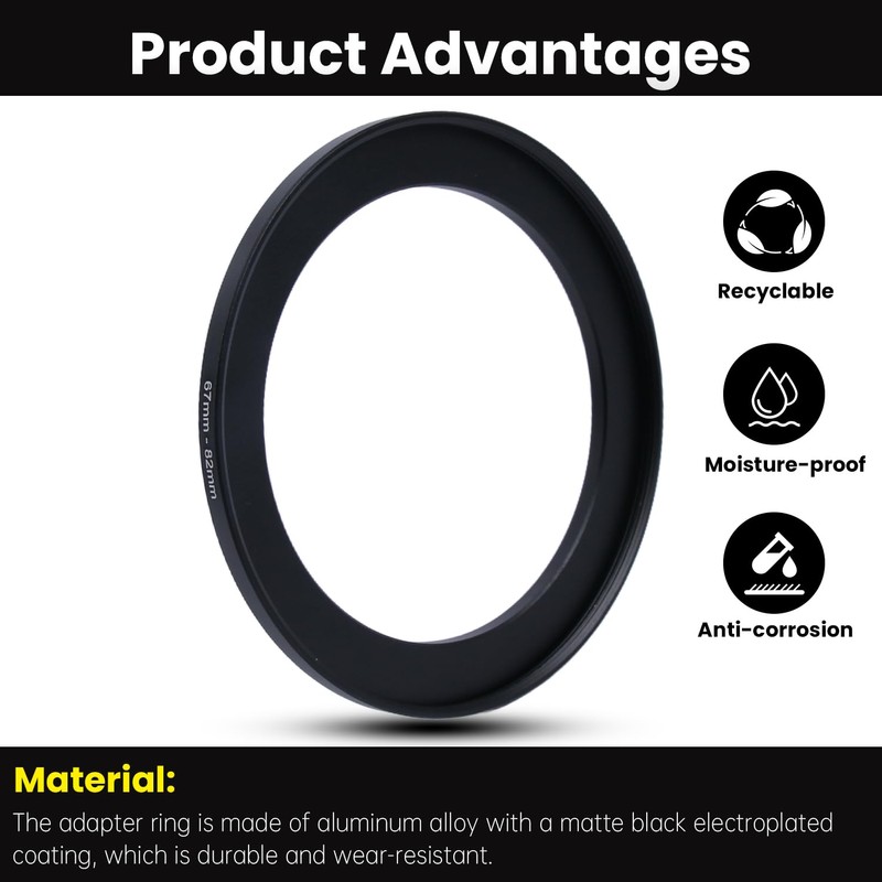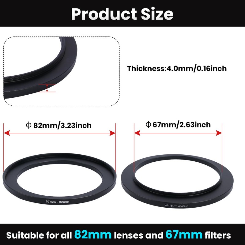 - COMPATIBLE: 67mm to 82mm Step-Up Ring Filter Adapter