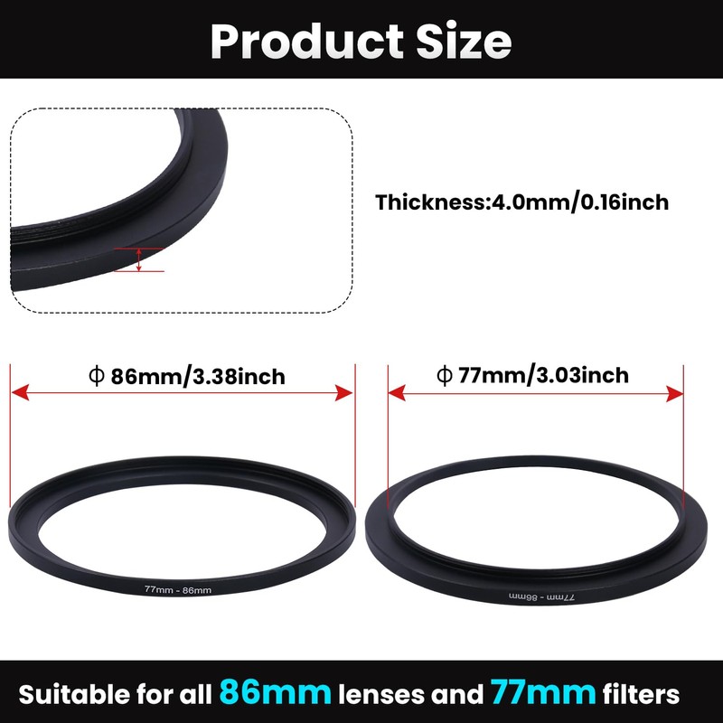 • COMPATIBLE: 77mm to 86mm Step-Up Ring Filter Adapter