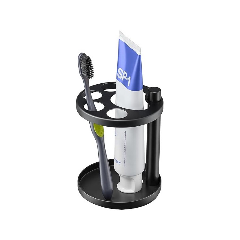 Metal Toothbrush Holder Stand for Bathroom: Stainless Steel Ventilated Organizer with Slots for Electric Toothbrushes, Toothpaste, Razors & Small Comb, Unique Footprint Base Design, Black