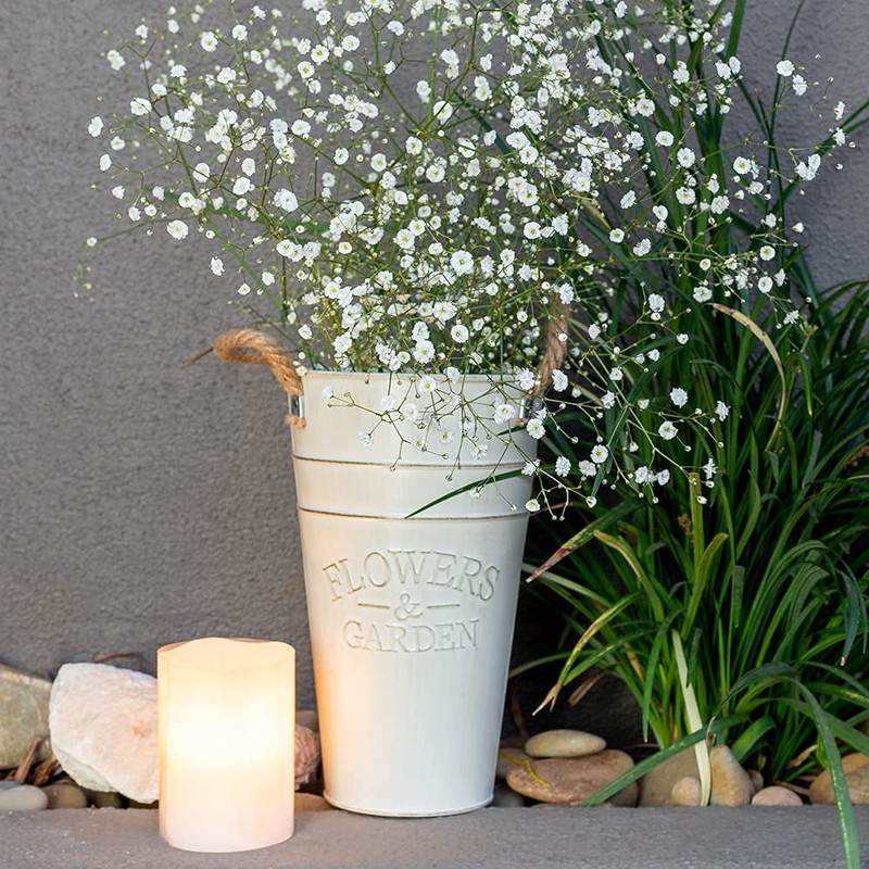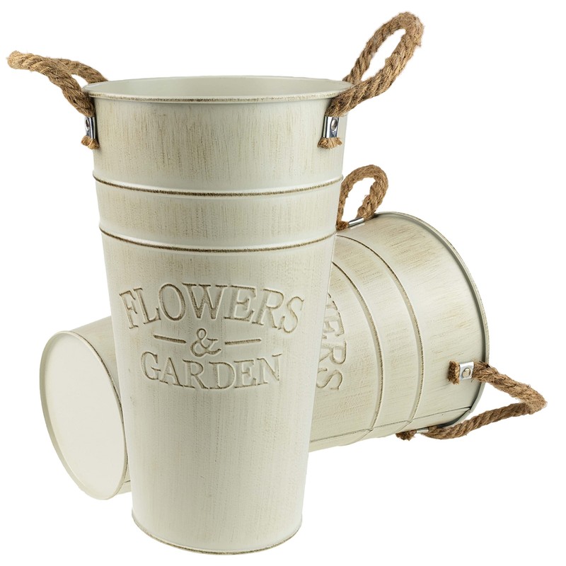 A set of 2 quality metal buckets with built-in rope handles are easy to carry and gives a vintage look, allowing you to create Fresh or Dried floral arrangements.