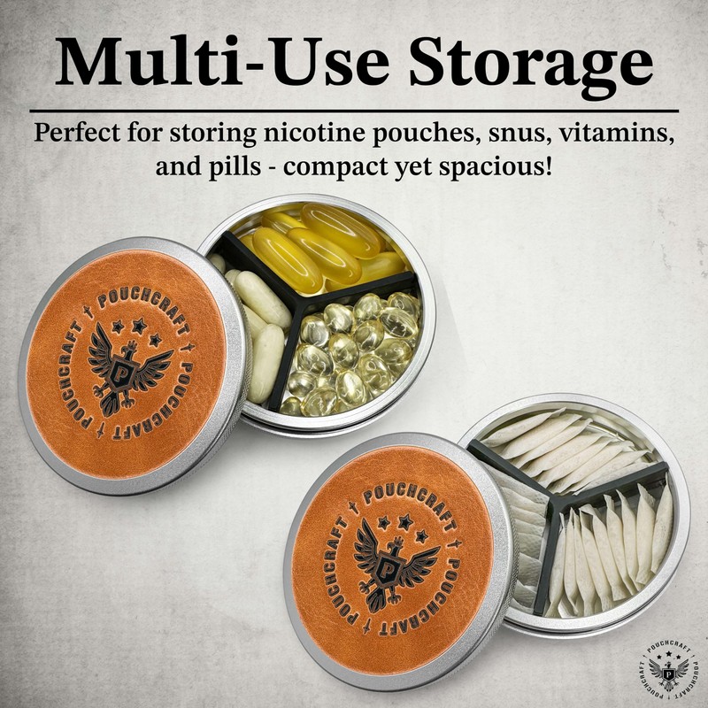 - ๐๐ก๐ ๐๐๐ง๐ญ๐ฅ๐๐ฆ๐๐งโ๐ฌ ๐๐ซ๐๐ฆ๐ข๐ฎ๐ฆ ๐๐ฒ๐ง / ๐๐ง๐ฎ๐ฌ ๐๐ญ๐จ๐ซ๐๐ ๐ ๐๐๐ง: A leather-topped Metal Zyn Can that embodies classic style with dependable durability. This two-piece aluminum design blends sleek, minimalist style with robust functionality, creating the perfect home for your nicotine pouches, snus, caffeine pouches, dip, pills, and more.
