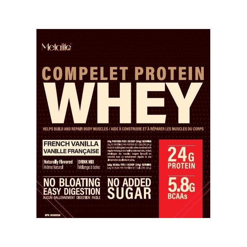 MetaLife Complete Whey Protein Powder – French Vanilla – 24g Good Protein per Serving, 5.8g BCAAs, No Added Sugar, Easy Digestion, Gluten-Free, GMO Free, 714 G (21 Servings) – Made in Canada