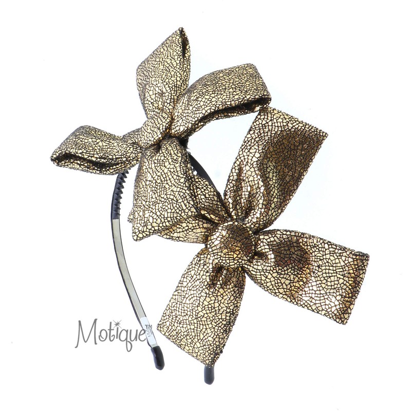 - Beautiful ribboned metal headband with 2 textured metallic bows at one side