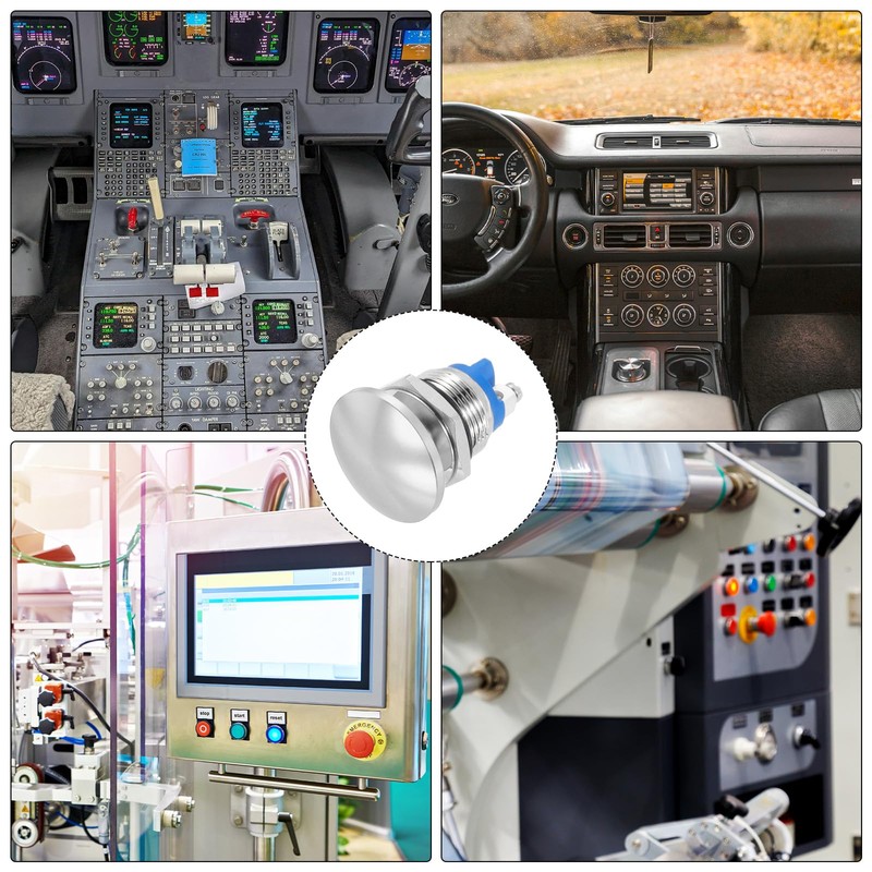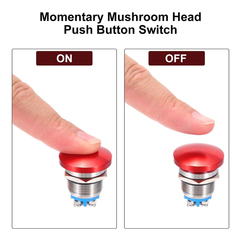 - Product Name: Mushroom Head Push Button Switch; Button Material:Metal Mounting size: 16mm/0.6 Inch; Total size: 23.5 x 30mm/0.93 x 1.2 Inch; Pin number: 2P(1NO); Poles : SPST; Waterproof Level: IP65 Action Type: Momentary; Rated Current: 5A; Rated Voltage: 5V/12V/24V/24V/110V/120V/250V DC/AC; Button Color: Silver; Package Content: 1 x Switches, 1 x Hexagon Fastening Nut, 1 x Rubber Seal Ring