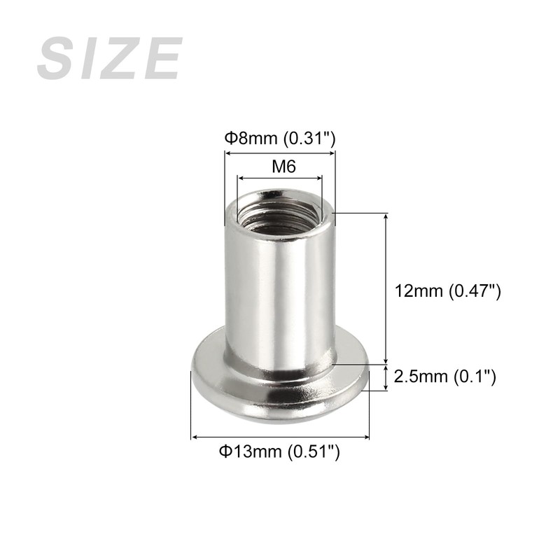 - [2]: SPECIFICATIONS - Female Thread Size: M6(D)x12mm(L); Cap Size: 2.5mm(T)x13mm(D)/0.1"x0.51";Sleeve Diameter: 8mm/0.31";Hex Width: 4mm/0.16"