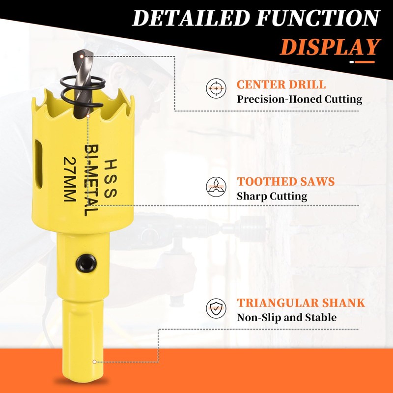 - [2]SPECIFICATION - Hole Saw Diameter: 27mm/(1-1/16"), Cutting Depth: 25mm/(1"), Shank Diameter: 9.5mm/(0.37"), Total Length: 82mm/(3.23") with Triangular Shank, with 1pc Center Drill Bit Diameter: 5mm/(0.2"), with 1pc Hex Key.