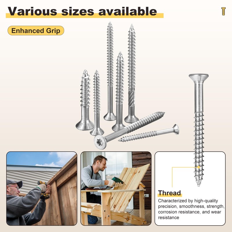 DESIGN - The star drive design ensures a secure grip, minimizing the risk of slippage during installation and removal. The fine-point 17-gauge tip allows for effortless penetration into different types of wood, including hardwoods, softwoods, and pressure-treated materials. Additionally, the coarse serrated threads provide a robust hold, reducing board separation and enhancing overall structural stability.