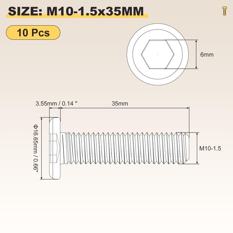 - [2]:SPECIFICATION - Thread Diameter: M10-1.5(Thread Dia x Pitch); Screw Length: 35mm; Head Size: 3.55 x 16.65mm/0.14 x 0.66inch(D*H); Hex Width: 6mm; Color: Silver Tone; Material: 304 Stainless steel