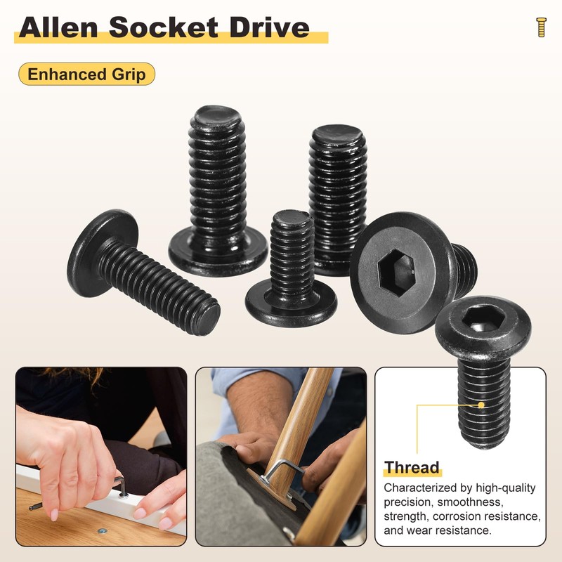 DESIGN - Choose Carbon Steel Fasteners for: Flat head Hexagonal socket head type, uniform force that is not easy to slip, easy to use by normal hex keys, T-shaped hex keys, and electric screwdrivers. Suitable for replacing old bolts at any time.
