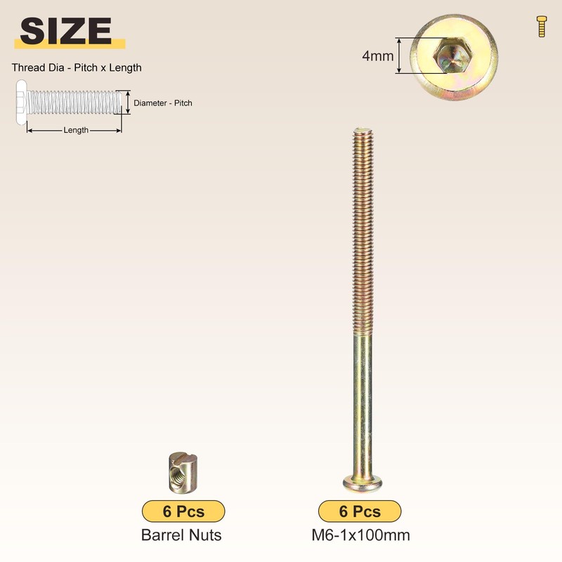 - [2]:SPECIFICATION: Product Name: Barrel Nuts and Flat Head Screws; Flat Head Screws Thread; Diameter: M6-1(Thread Dia x Pitch); Flat Head Screws Screw Length (mm):100; Color: Yellow; Applicable Hole Size: 8mm; Material: Carbon Steel; QUANTITY INCLUDED - 6Pcs x Flat head socket cap screw - 6Pcs x Barrel Nuts