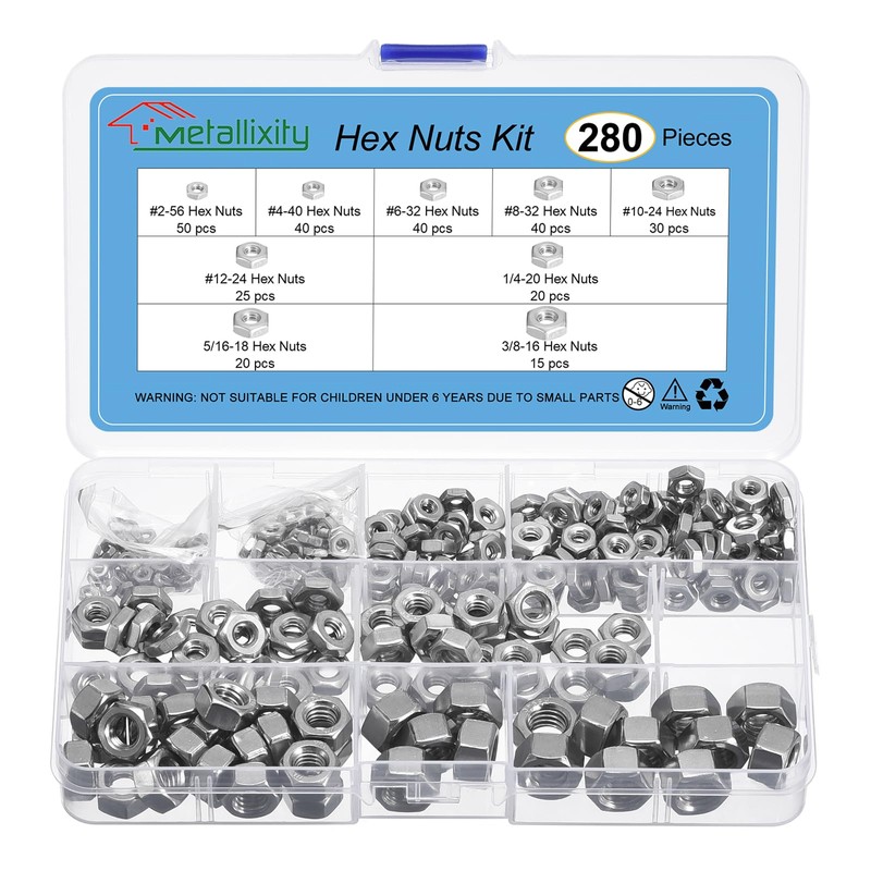 METALLIXITY Hex Nuts Assortment Kit (#2-56, #4-40, #6-32, #8-32, #10-24, #12-24, 1/4-20, 5/16-18, 3/8-16) 280Pcs, 304 Stainless Steel Hexagon Nut Hardware