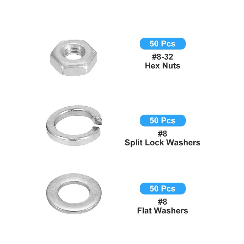 QUANTITY INCLUDED - 50pcs x#8-32 Hex Nuts; 50pcs x #8 Flat Washers; 50pcs x #8 Split Lock Washers