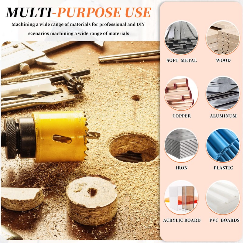 - [1]APPLY TO - 4341 High Speed Steel Hole Saw Kit is engineered for drilling soft metal, wood, and synthetic materials including pvc, plastic, and plasterboard, with specific compatibility for structural alloys such as low-carbon steel, brass, and aluminum alloys. It operates effectively on hand-held electric drills, bench-mounted vertical drills, and portable magnetic base drills, serving critical functions in automotive maintenance, metal fabrication, and carpentry renovation projects.