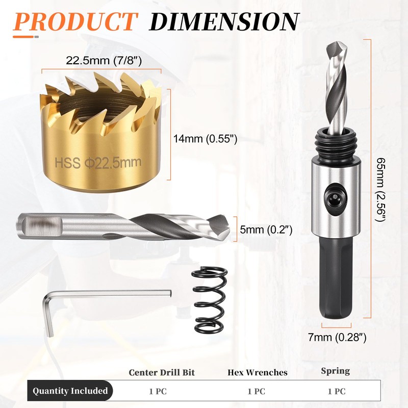- [2]SPECIFICATION - Hole Saw Diameter: 22.5mm/(7/8"), Height: 14mm/(0.55"), Shank Diameter: 7mm/(0.28"), Total Length: 65mm/(2.56") with Triangular Shank, with 1Pcs Center Drill Bit Diameter: 5mm/(0.2"), with 1Pcs Hex Key.
