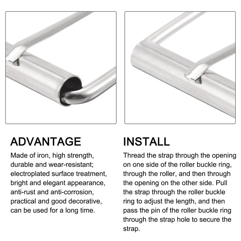 INSTALL: Thread the strap through the opening on one side of the roller buckle ring, through the roller, and then through the opening on the other side. Pull the strap through the roller buckle ring to adjust the length, and then pass the pin of the roller buckle ring through the strap hole to secure the strap.