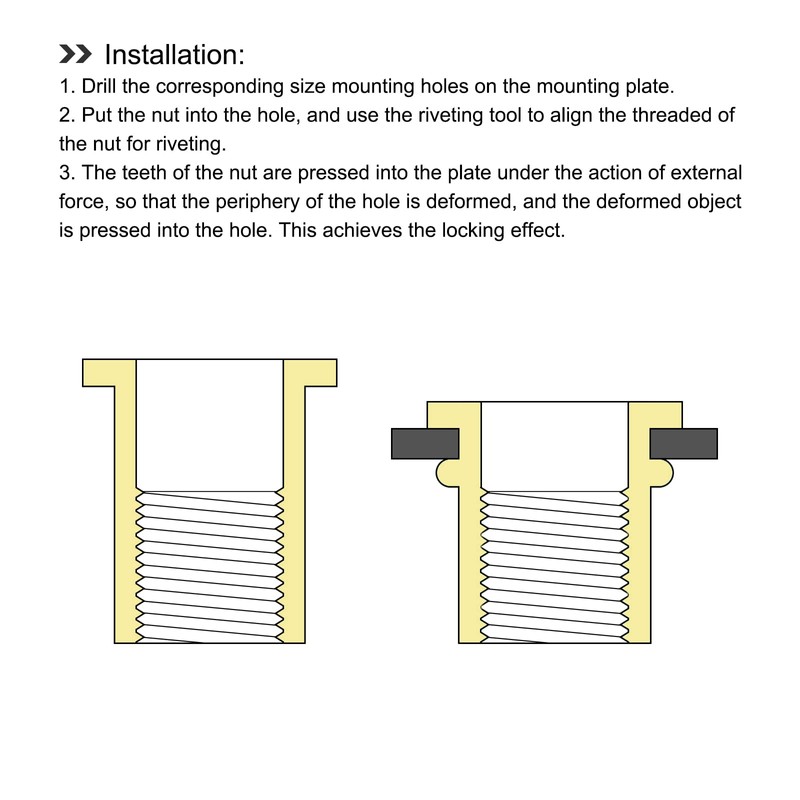 - [5]: INSTALL - The rivet nut is designed to solve the problem that the material is too thin to process the thread. It needs to be riveted with a pneumatic or hand rivet tool. The teeth of the nut are pressed into the plate by an external force so that the periphery of the hole is deformed, and the deformed object is pressed into the guide groove. This achieves the locking effect.