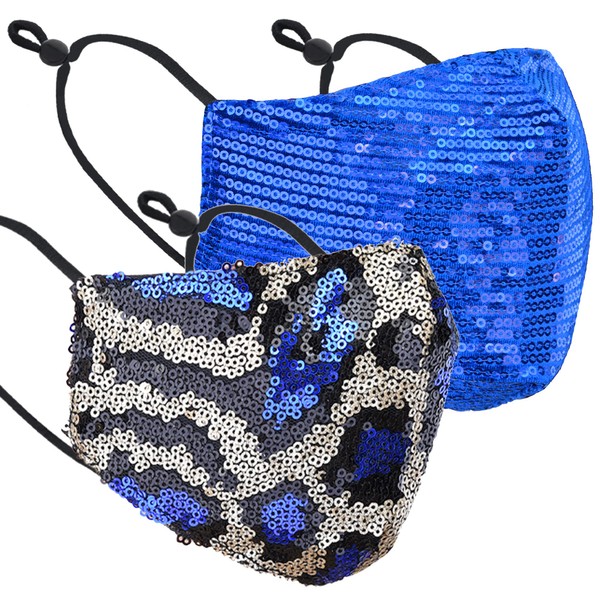 metaltree98 Women's Lady's Animal Print Sequin Glitter Shiny Bling Fashion Face Mask Adjustable Ear Loops Washable Reusable, Breathable Comfort NON- Medical Safety (2 Mask Set - Animal Blue/Blue)
