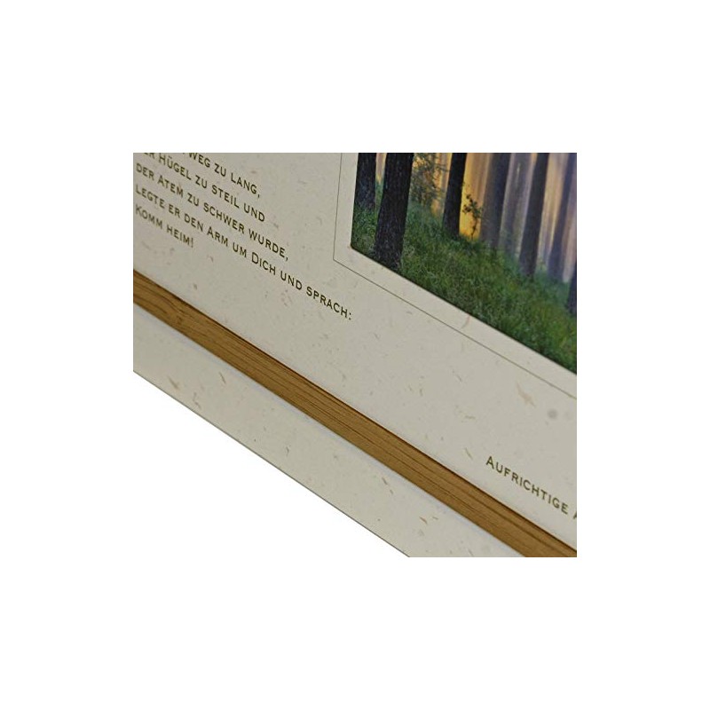Our stylish double cards for condolence in the format 17 x 11.5 cm and a high-quality, white envelope, are printed on sturdy bright white chromo sulphate cardboard in the best quality and finished with a unique wooden appliqué.