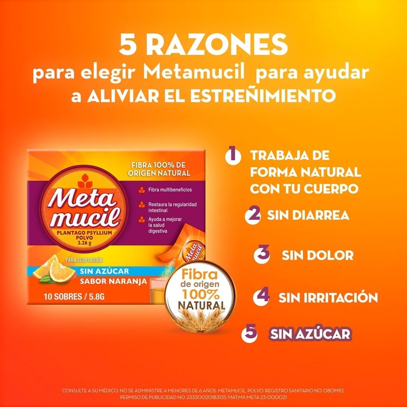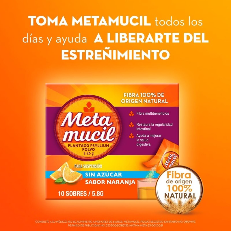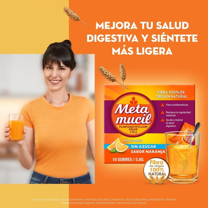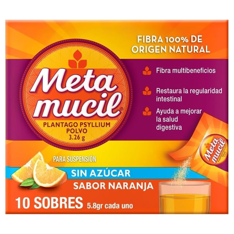 Metamucil te ayuda a cuidar tu sistema digestivo con fibra de psyllium 100% natural. Gracias a su fórmula, apoya la regularidad intestinal, contribuye a la salud cardiovascular y proporciona sensación de saciedad que ayuda en planes de control de peso. Su práctico formato en sobres individuales con delicioso sabor naranja lo convierte en el complemento perfecto para tu rutina diaria.