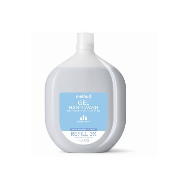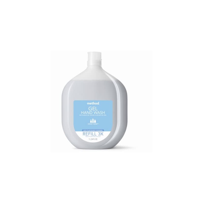 - Brand Name: Method Scent: Sweet Water Antibacterial: No Product Type: Gel Hand Wash Refill Container Size: 34 oz Number in Package: 1 pk Refill: Yes Packaging Type: Bottle