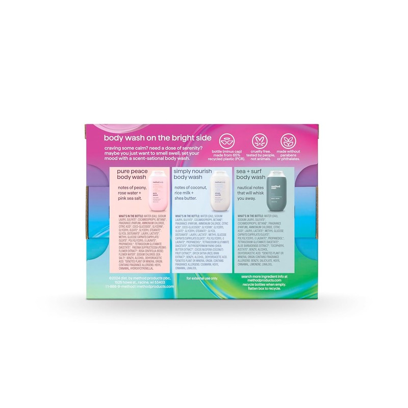 Treat yourself or someone special to the Method Body Wash Gift Set, featuring three luxurious, travel-sized body washes in refreshing and soothing scents. This set includes Pure Peace, Simply Nourish, and Sea + Surf, offering a variety of fragrances to suit every mood. Each 3.4 oz bottle is packed with nourishing ingredients to cleanse and hydrate your skin, leaving it feeling soft and refreshed. The sulfate-free, paraben-free formulas ensure a gentle yet effective cleanse, perfect for all skin types. Whether you're at home or on the go, this gift set provides the ideal size for travel while delivering a spa-like experience anytime, anywhere.