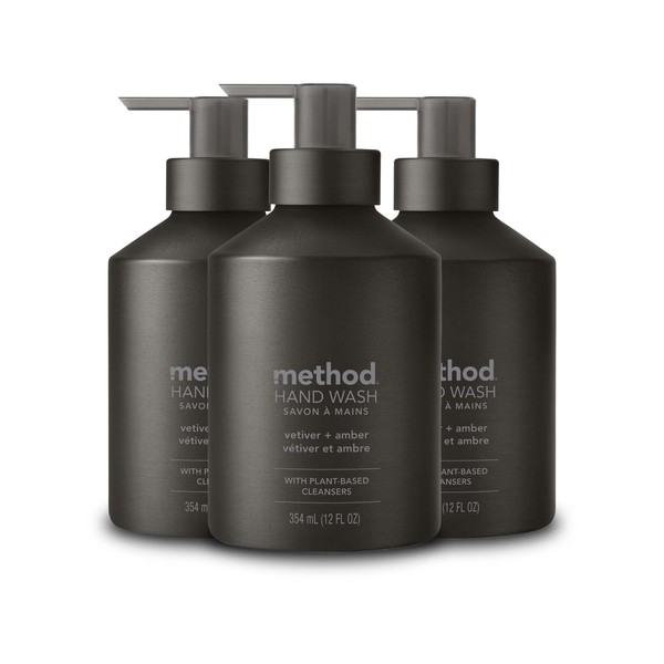 Method Method Gel Hand Soap, Vetiver + Amber, Reusable Black Aluminum Bottle, Biodegradable Formula, 12 oz (Pack of 3)