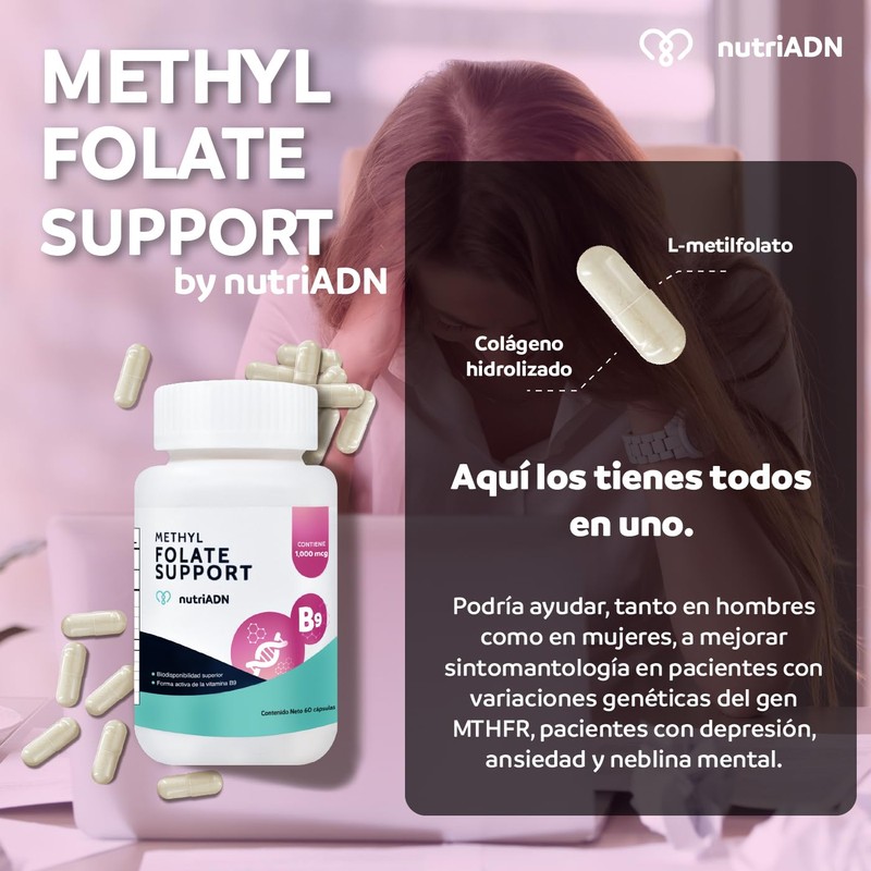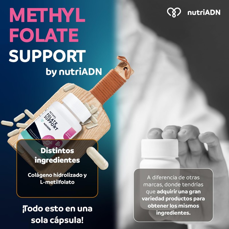 Methyl Folate Support by nutriADN es la forma activa de la vitamina B9 (ácido fólico) en el cuerpo. A diferencia del ácido fólico sintético, que se encuentra en algunos suplementos, el metilfolato no requiere conversión enzimática para ser utilizado por el organismo. Aquí algunos beneficios asociados con la toma de metilfolato: Mejora en la Metilación: El metilfolato es crucial para el proceso de metilación, un proceso bioquímico fundamental en el cuerpo. La metilación es esencial para la regulación genética, la síntesis de neurotransmisores y la desintoxicación. Soporte para la Salud Mental: Se ha sugerido que el metilfolato puede desempeñar un papel en la síntesis de neurotransmisores, como la serotonina y la dopamina, lo que puede tener beneficios para la salud mental y emocional. Reducción del Riesgo de Defectos del Tubo Neural: Al igual que el ácido fólico, el metilfolato es crucial durante el embarazo para prevenir defectos del tubo neural en el feto. Se recomienda especialmente a mujeres embarazadas o que estén planeando quedar embarazadas. Apoyo Cardiovascular: Algunas investigaciones sugieren que el metilfolato podría desempeñar un papel en la reducción de los niveles de homocisteína, un aminoácido vinculado a problemas cardiovasculares cuando está elevado. Contribución a la Formación de ADN y ARN: El metilfolato participa en la síntesis de ADN y ARN, procesos cruciales para la replicación celular y el mantenimiento genético. Apoyo a la Salud Cerebral: Se ha investigado el papel del metilfolato en la salud cerebral y su relación con la prevención de condiciones neurodegenerativas. Sin embargo, se necesita más investigación en este ámbito. Mejora en la Absorción en Personas con Mutaciones Genéticas: Algunas personas tienen variantes genéticas (polimorfismos del gen MTHFR) que pueden afectar la conversión del ácido fólico a su forma activa. En estas personas, la suplementación con metilfolato puede ser más efectiva. Menor Riesgo de Complicaciones en Pacientes con MTHFR: Algunas investigaciones sugieren que las personas con variantes del gen MTHFR podrían experimentar beneficios, como una reducción del riesgo de complicaciones relacionadas con la homocisteína, mediante la suplementación con metilfolato. Es importante destacar que, si bien el metilfolato puede tener beneficios, su uso debe ser supervisado por un profesional de la salud, ya que la suplementación con altas dosis puede no ser adecuada para todas las personas. Además, algunas personas pueden experimentar efectos secundarios o interacciones con otros medicamentos, por lo que se recomienda la consulta con un médico antes de iniciar la suplementación.
