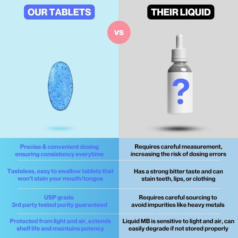 Unlike liquid Methylene Blue drops, which can be messy and difficult to measure, our USP Grade Ultra Pure Methylene Blue tablets. offer a clean, convenient, and precise alternative. Each tablet delivers a consistent 10mg dose (equivalent to 20 drops)., making it easier than ever to incorporate Methylene Blue for humans into your daily wellness routine.