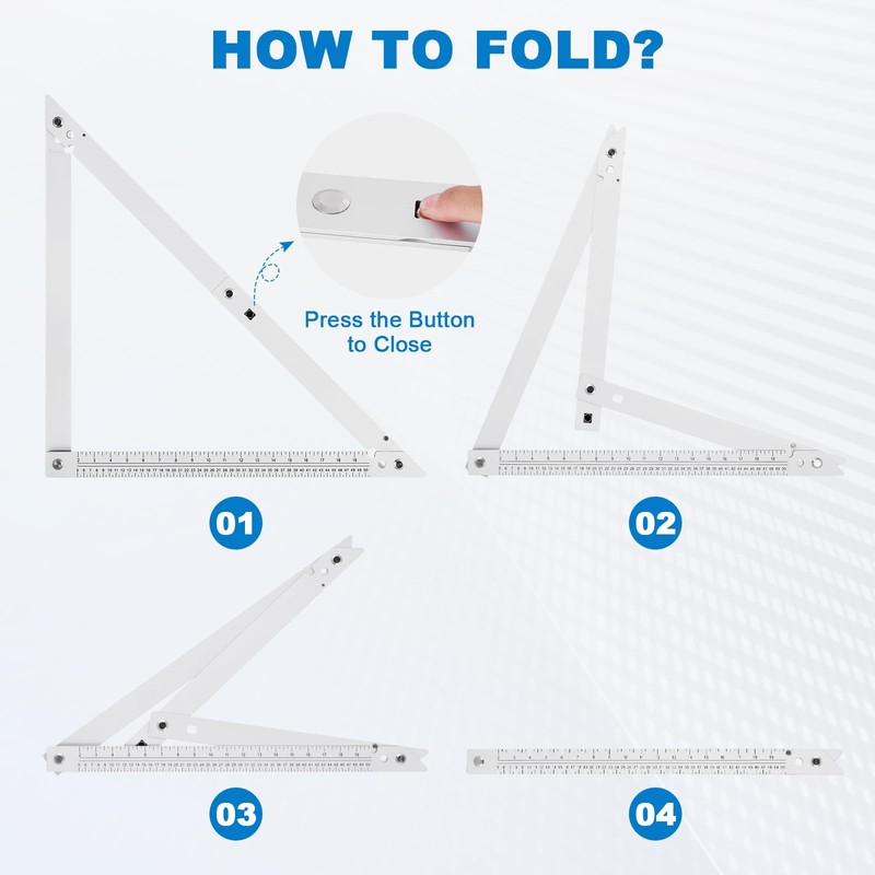 - 【Foldable Design】 This carpenter's square can be folded up to next to nothing, and is thus very easy to store. The press button action to unlock to open or close is easy. The square layout tool provides a true 90 degree angle and two 45 degree angles.