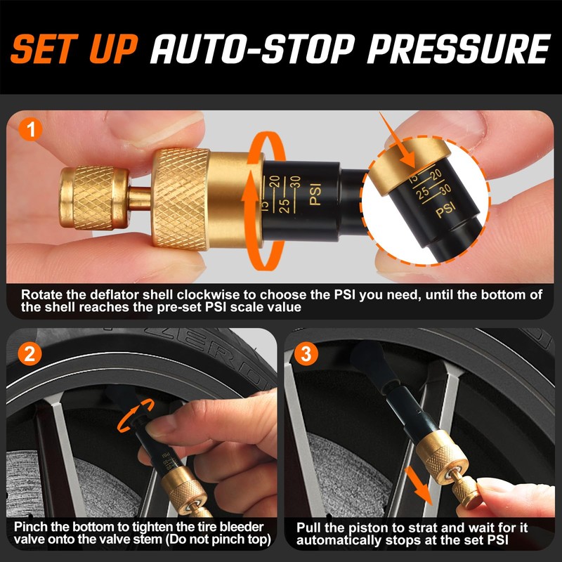 - FLEXIBLE ADJUSTMENT - No Tools are required. The air down tire deflators has a clear scale display, which can adjust the tire pressure from 30 to 10 PSI. When the set PSI value is reached, it will stop deflation