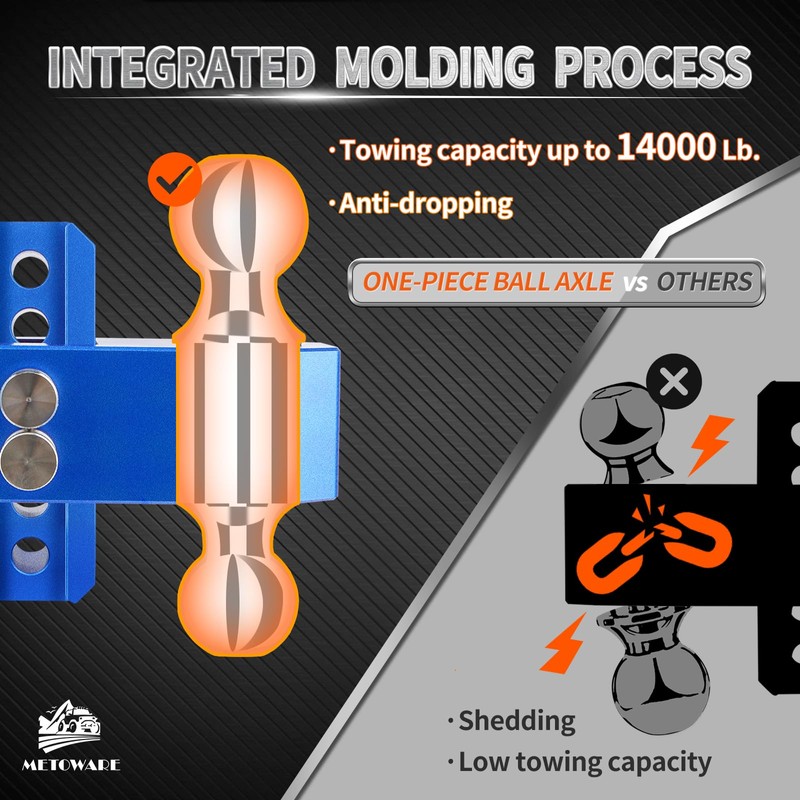 METOWARE adjustable trailer hitch that’s meticulously crafted to work with all 2“×2” receivers for all your towing needs. Features up to 14,000lbs towing capacity and maximum 8” adjustable height, 4’’, 6’’, 8’’up or down adjustment with 2" and 2-5/16” balls available for your needs.Our hitches are available for vehicles of different heights and are universally compatible with vehicles with standard 2" receivers.