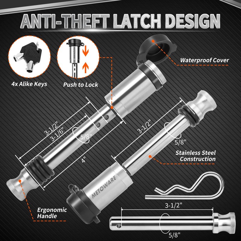 - STRONG SECURITY - Each adjustable trailer hitch includes two sets of stainless steel locks with ergonomically designed handle for ease of use. The all-weather cover cap of our trailer hitch lock keeps the keyhole away from moisture, dust and rust. Equipped with 8 rubber O rings to reduce the abnormal sound caused by the contact between the shank and the receiver. High strength dual pin lock can ensure the safety of the trailer and the hitch when you leave the car.