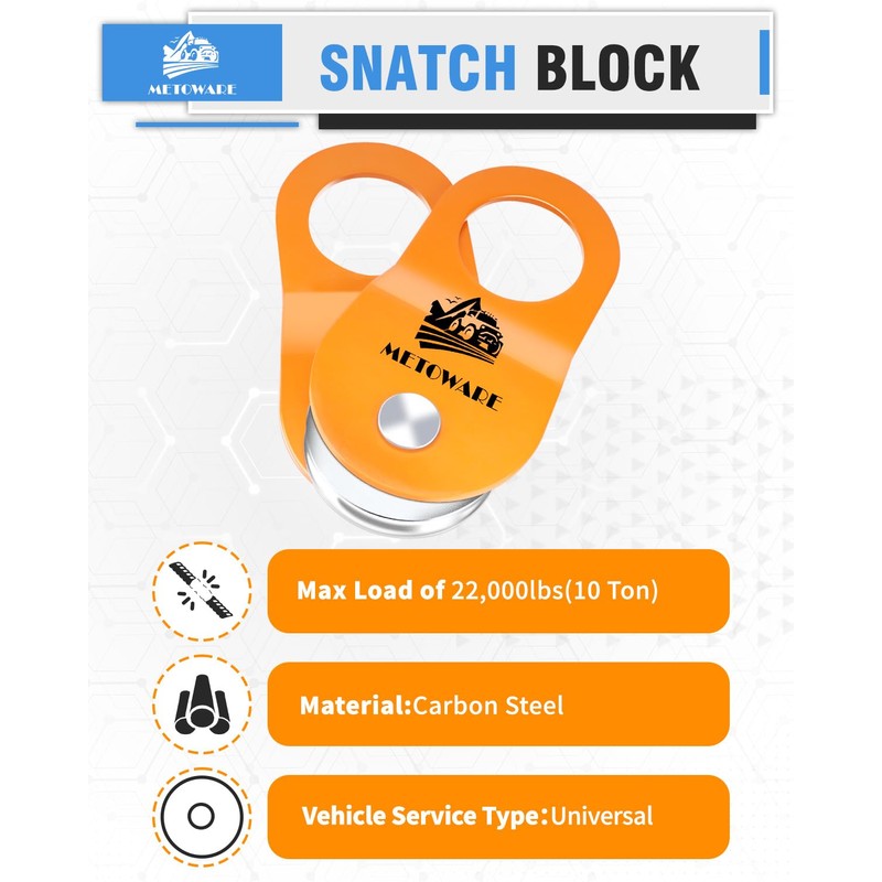 - SNATCH BLOCK: Made of heavy-duty steel, max load at 10 Ton (22,000 LBS), works with 7/32' - 3/8' steel cable or synthetic rope. And it's finished with durable corrosion-resistant electrophoretic paint finish, which is not only anti-corrosion and rust-proof, but also strong and durable.Suitable for most off-road recovery situations