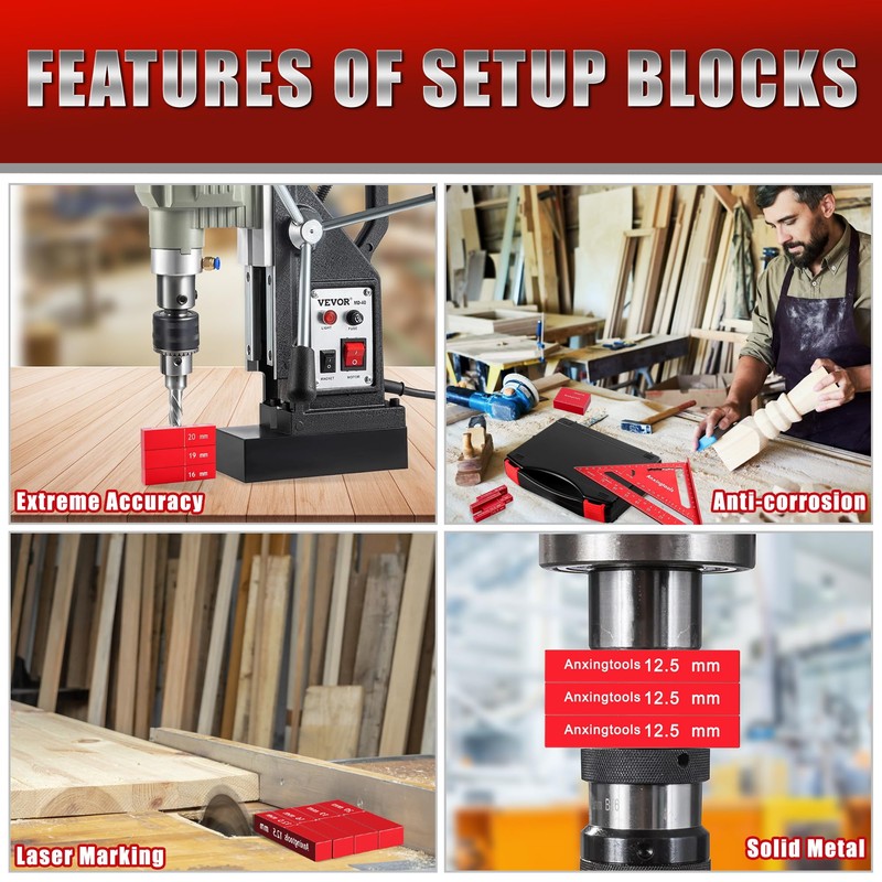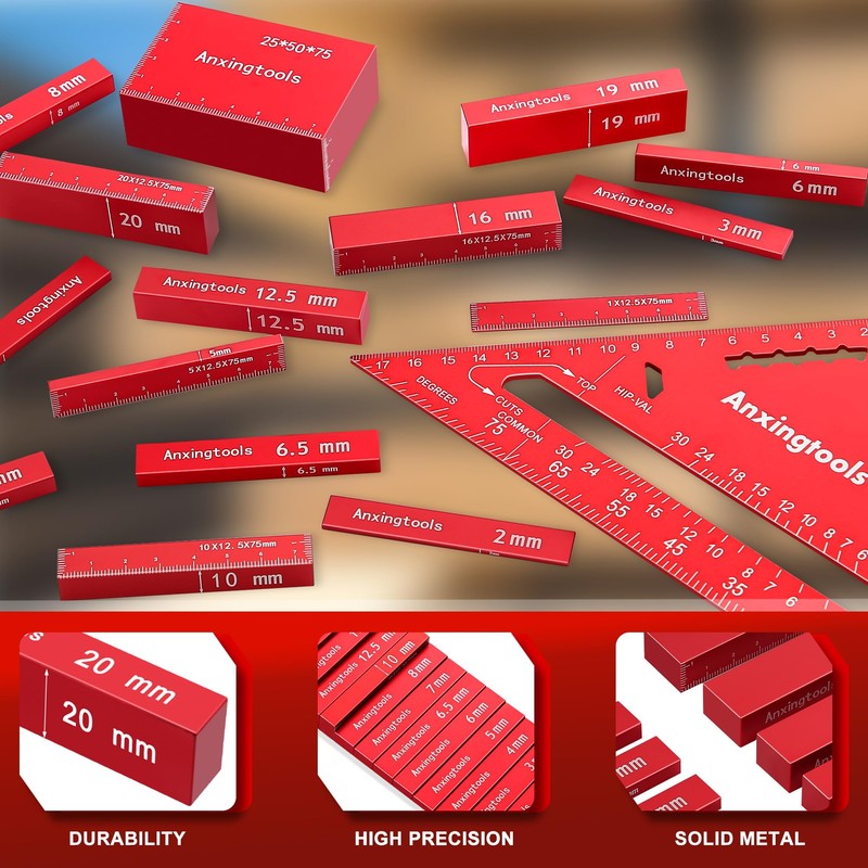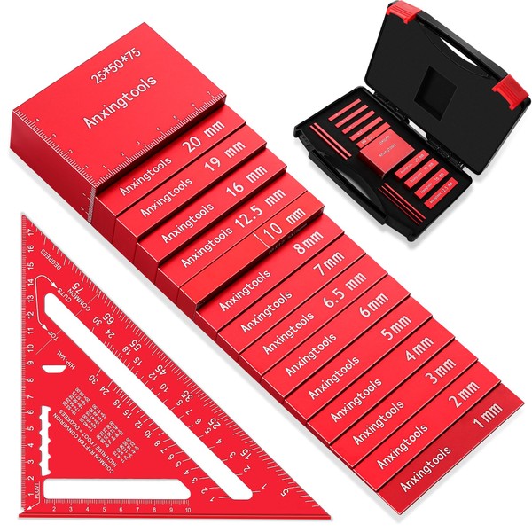 - UNMATCHED PRECISION: adjustable setup block height gauge are all 7.5cm long. Accurate sizes of each individual piece (15 total): 1mm, 2mm, 3mm, 4mm, 5mm, 6mm, 6.5mm, 7mm, 8mm, 10mm, 12.5mm, 16mm, 19mm, 20mm, 25*50*75mm.The setup blocks can easily set the height of the fence, blades bits and other cutters according to the needs, which is faster and more accurate than using a combined ruler.