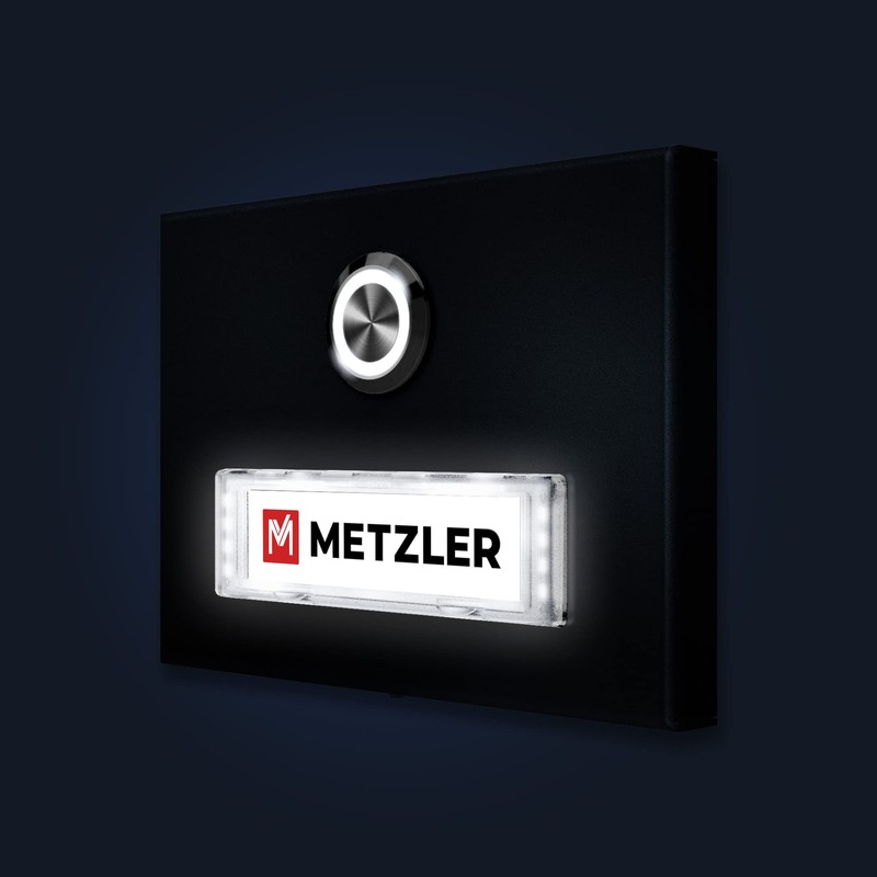 Metzler surface-mounted LED doorbell with replaceable name plate.
