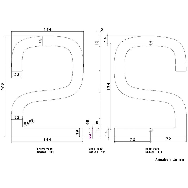 House number numbers in RAL7016 anthracite in modern font, height 20 cm, laser-cut house number in modern font made of stainless steel. To protect against weather and environmental influences in the trendy colour anthracite RAL7016 powder-coated. Thanks to the powder coating of the house number, the numbers are resistant to wind, rain and other environmental influences. The house numbers are made in Germany. The anthracite colour stands out visually from the outer colour of the plaster and is therefore clearly visible from a distance. Thanks to the spacers welded to the back, the house number stands out from the facade and creates a 3D effect.