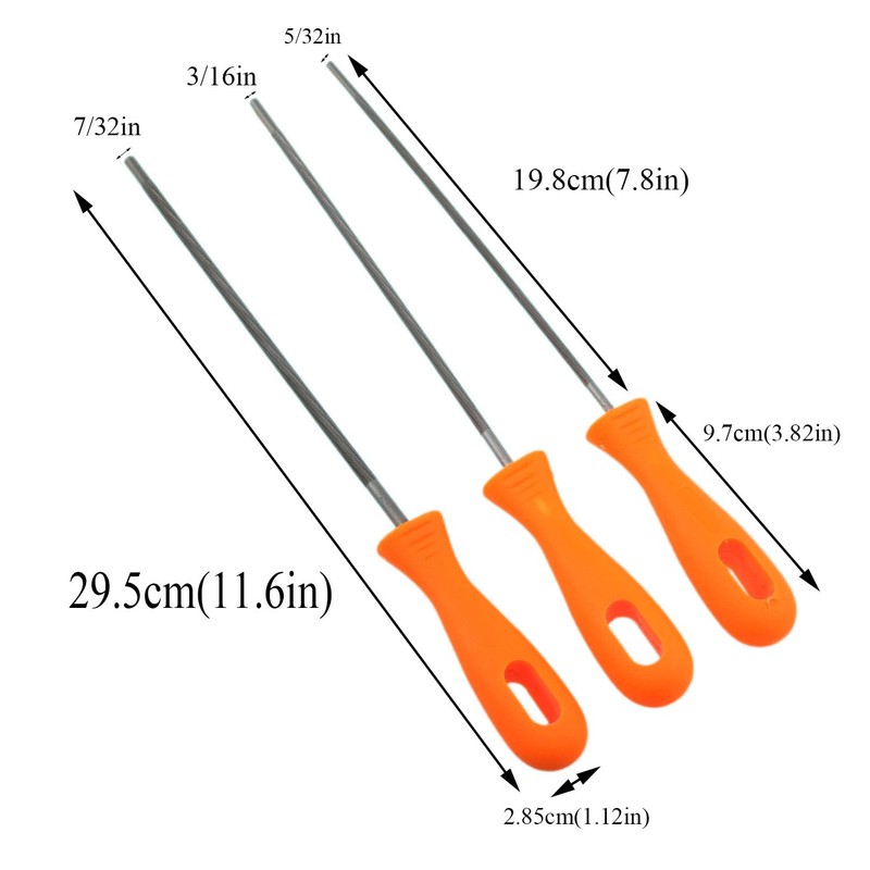- These chainsaw file sets are designed in 3 different sizes, including 5/32 inch, 7/32 inch and 3/16 inch, providing 3 size options to better sharpen your chainsaw and help improve your chainsaw cutting efficiency.