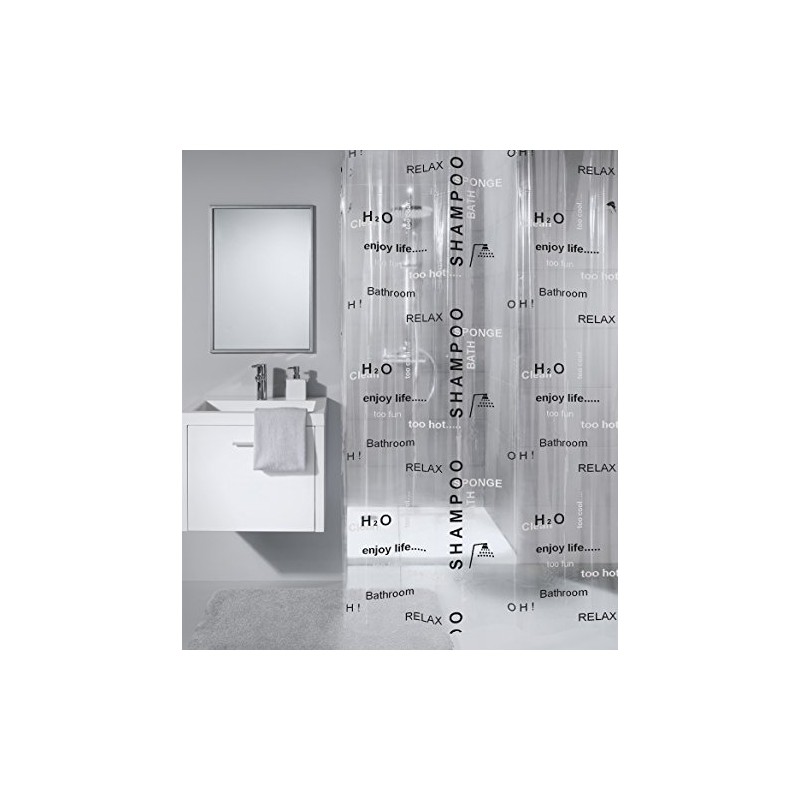 - Modern shower curtain, transparent with lettering